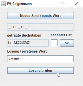 Auch hier gäbe es noch weitere Möglichkeiten zum Markieren, z.B. eine zusätzliche Reihung vom Typ boolean[ ]. Der Fantasie des Programmierers bzw. der Programmiererin sind kaum Grenzen gesetzt. Allerdings sollte man bei zusätzlichen Datenstrukturen im Hinterkopf behalten, dass ein Synchronisierungsproblem entstehen kann. Im Sinne der Objektorientierung wäre deshalb eine eigene Klasse Ratebegriff besser, die als ein Attribut das zu ratende Wort und als zweites Attribut einen boolean-Wert schonVerwendet hat. Die Reihung müsste dann ähnlich wie in P7_AlleFragen vom Typ Ratebegriff[ ] sein.