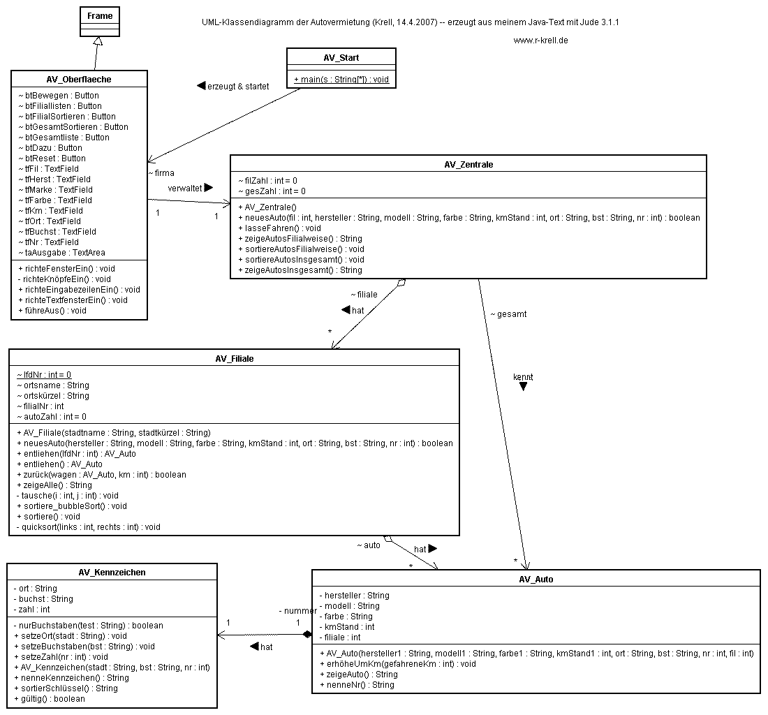 (Das Diagramm wurde übrigens mit der gratis erhältlichen Community Edition des Programms JUDE [=Java-oriented UML- Diagram Editor] der japanischen Firma Change Vision erstellt. Der Download der etwa 6 MB großen Setup-Datei ist nach kostenloser Registrierung möglich).