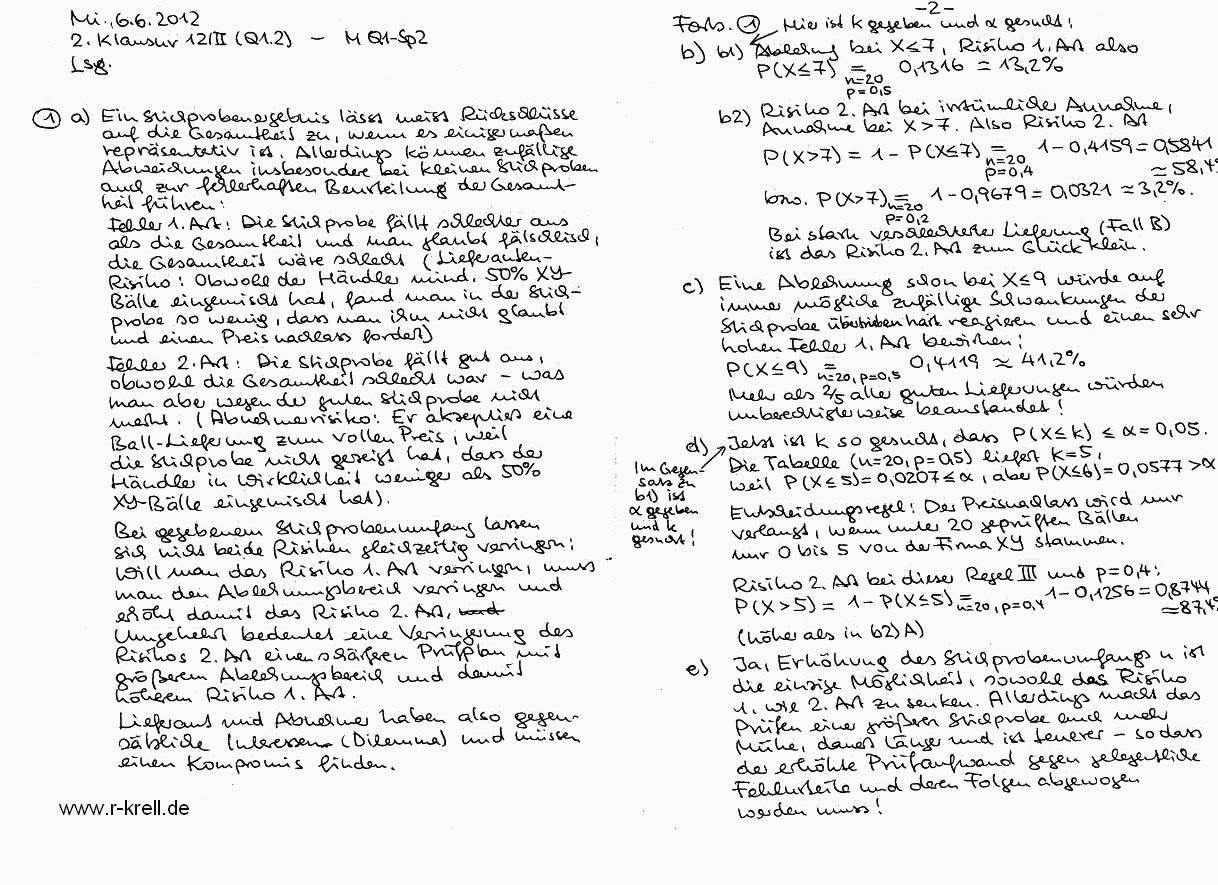 4. Klausur der Qualifikationsphase 1 (6.6.2012): Stochastik II -- Qualitätskontrolle und Hypothesentest