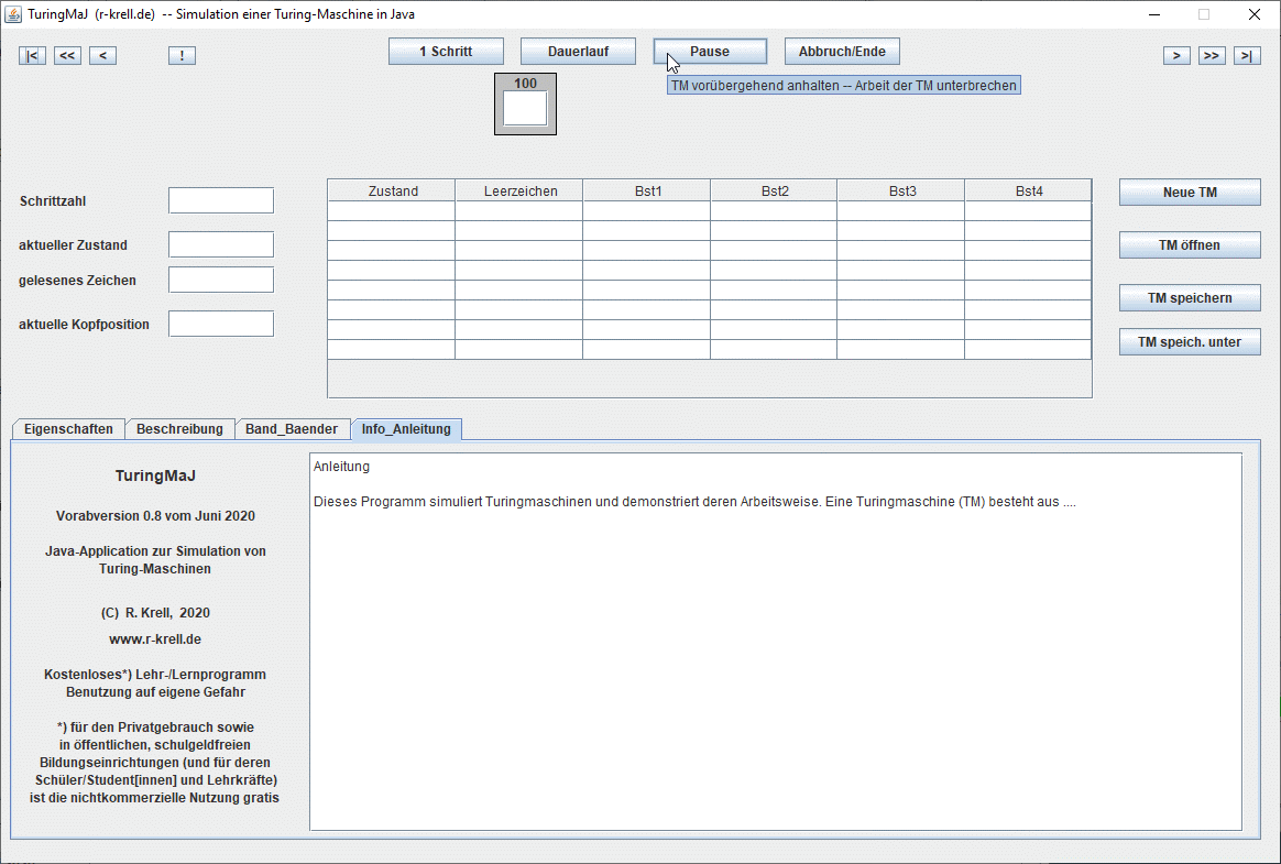 Wie man sieht, wurden gegenüber der Handskizze aus Kapitel 1 Abschnitt b2) oben auf dieser Seite schon einige Korrekturen vorgenommen. Insbesondere sind die Schaltflächen "Neue TM", "TM öffnen", "TM speichern (unter)" jetzt immer sichtbar, sollen aber nur bei Pause oder Abbruch/Ende benutzbar und während des Ablaufs der Turingmaschine deaktiviert sein. Weiterhin bin ich noch im Zweifel, wie man am besten (in der 1. Registrierkarte Eigenschaften) die Eingaben in die Maschinentafel vornimmt. Die im Moment vorgesehene Eingabemöglichkeit per 'Spinner' (wo man jeweils Zeichen, Zustand und Kopfbewegung aus dem vorher festgelegten Vorrat per Mausklick auf die Auf-/Ab-Pfeiltasten auswählt) verhindert zwar Fehleingaben, ist aber beim Abschreiben einer längeren Maschinentafel aus einem Buch oder einer gedruckten Veröffentlichung langwieriger als das Eintippen jeweils eines kompletten Maschinentafeleintrags per Tastatur in ein Textfeld. Für das Band habe ich schon eine solche Text- bzw. Stringeingabe der gesamten Bandinschrift vorgesehen.
