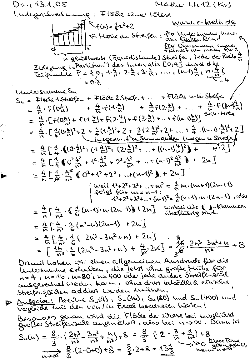 Da trotz großer Streifenzahl die Ergebnisse noch nicht allzu genau sind, folgte natürlich später die algebraische Berechnung für n Streifen mit der bereitgestellten Summenformel für 12 + 22 + 32 + ... + m2 = m (m+1) (2m+1) / 6 [vgl. nachfolgendes Arbeitsblatt vom 13.1.05. Dort ist für die Untersumme m = n-1]. Aber die numerischen Berechnungen von Hand und in Excel hatten deutlich gemacht, worum es ging, und wie man für praktische Fälle zahlenmäßige Näherungen erhalten kann. Die Schülerinnen und Schüler hatten ein Gefühl dafür entwickelt, was Ober- und Untersumme sind.